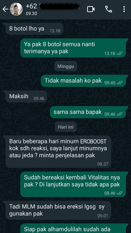 setelah konsumsi Eroboost secara rutin, istri saya jadi ketagihan karena libido saya makin tinggi dan tahan lama di ranjang. terimakasih Eroboost