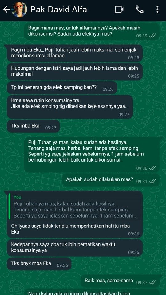 Istri saya kaget dengan perubahan ini. Akhirnya saya teruskan konsumsinya sampai sekarang. Suplemen herbal ini sangat aman karena bahan alaminya tidak membuat detak jantung kita berdetak tidak normal dan efeknya bertahan lebih lama karena tidak menyebabkan ketergantungan.”
